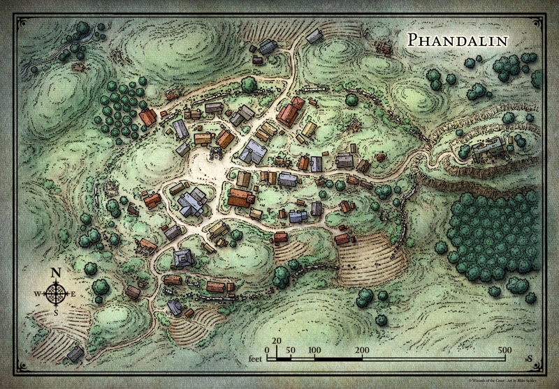 Phandalin ist ein Menschendorf südöstlich von Niewinter wo die Hochstraße über den Dreieberpfad in einen kleinen Pfad übergeht. Im Jahr 1487 wurde es besiedelt und ist eine Grenzsiedlung, die von Bauern und Schürfern bewohnt ist, die nach Reichtümern in den Schwertbergen suchen.